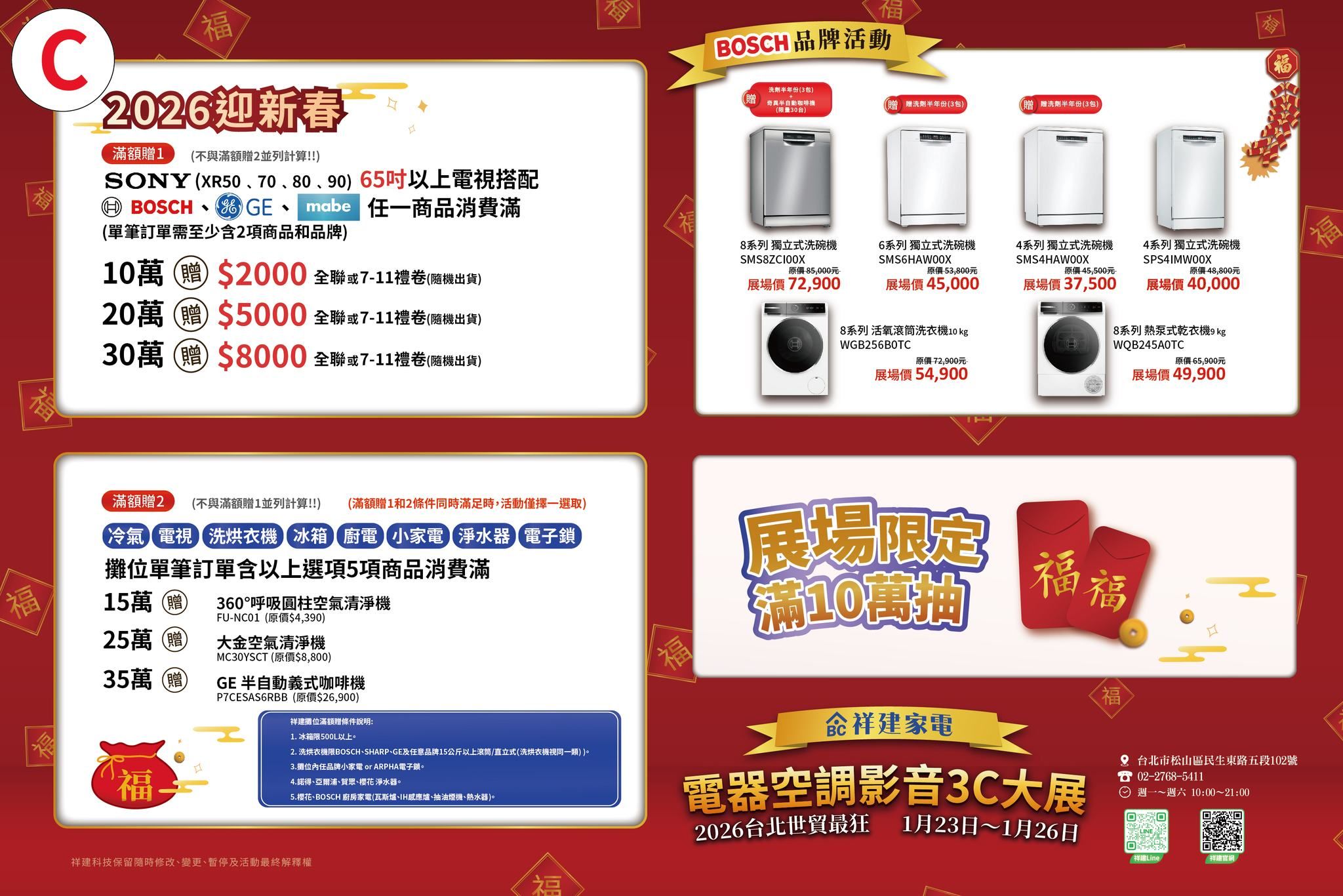 公會主辦之電器展一直以「優惠回饋與品質保證」作為舉辦之目的,電視、冷暖氣機、電冰箱、洗衣機、乾衣機、吸塵器、除濕機、洗碗機、排油煙機、瓦斯爐、音響、喇叭、卡拉OK等皆推出2026史上最猛電器展覽驚爆加碼優惠,除了2026政府補助最高5000元(汰舊換新節能補助+減徵貨物稅),原廠再加碼最高可省下數萬元以上,還有買家電加碼送豪禮活動,歡迎大家提早預約參觀,現場詢價有問有便宜!