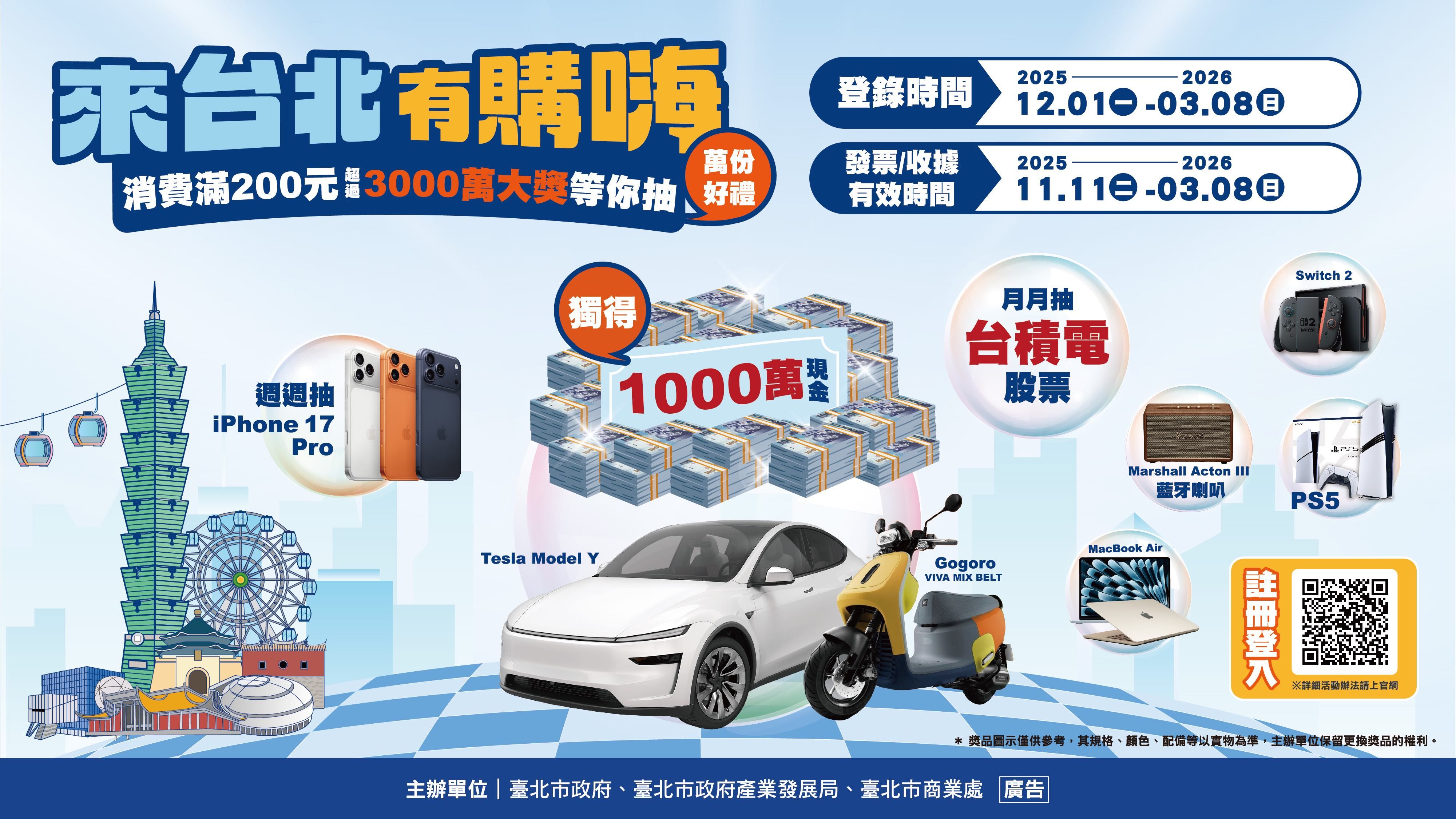 除了展場驚爆優惠、贈品、滿額抽10萬購物金...等,北市更推出「來台北有夠嗨」活動,只要登記北市發票/收據消費滿200元,就有超越3000萬大獎等你抽!