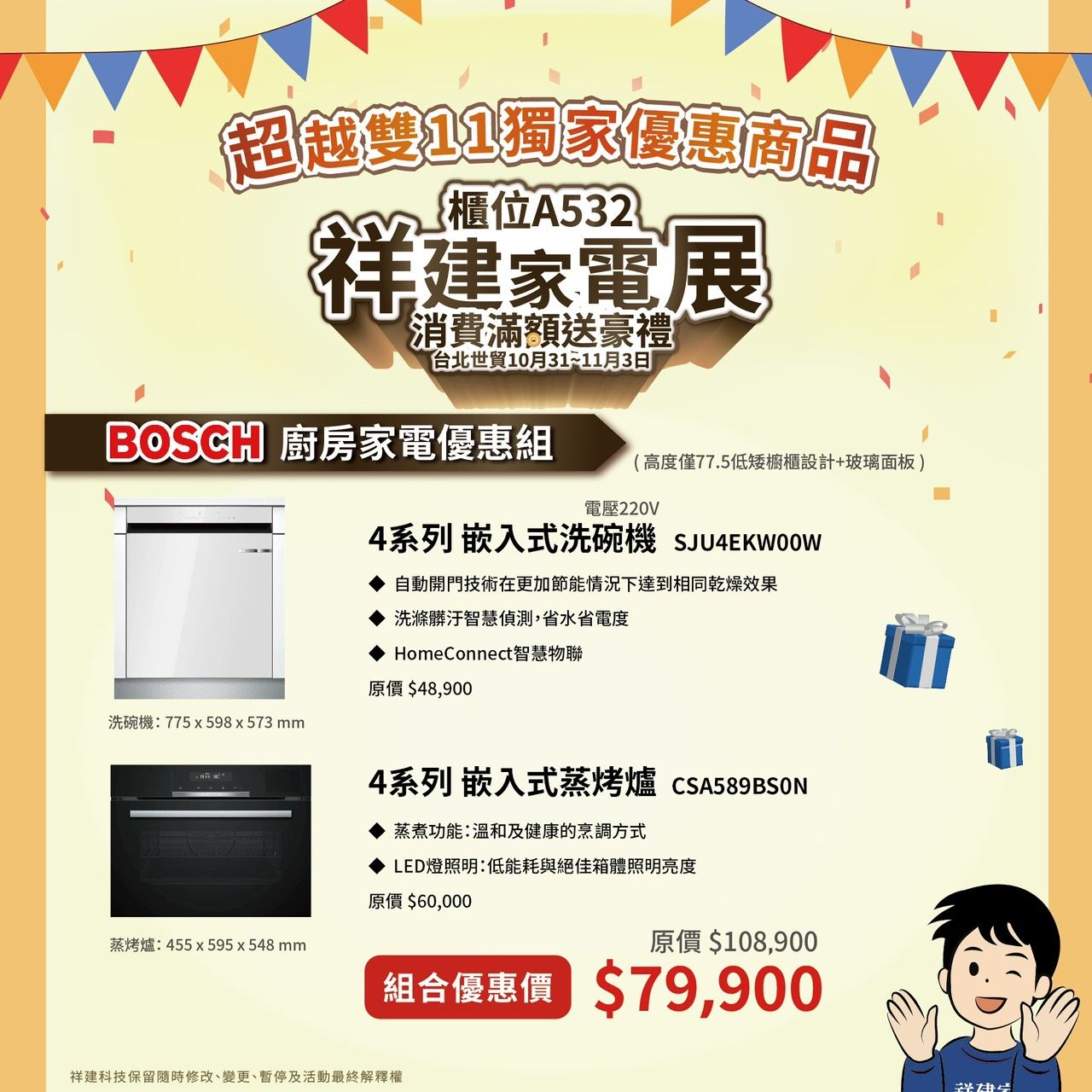 BOSCH 4系列 下嵌式洗碗機 SJU4EKW00W+ 4系列 嵌入式蒸烤爐 CSA589BS0N