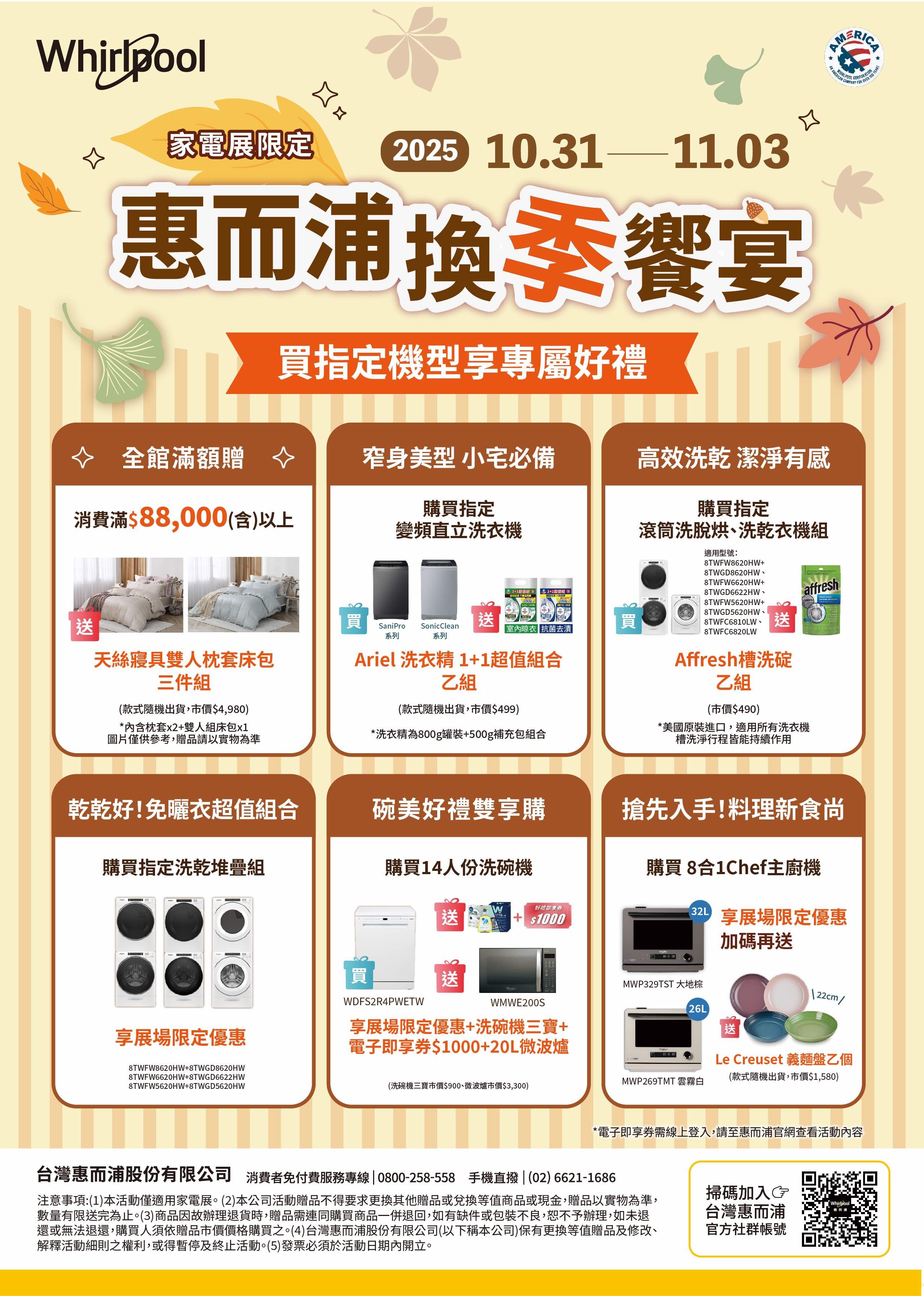 *惠而浦全品項消費滿$88,000加贈Hoyacasa 天絲床包三件組一組