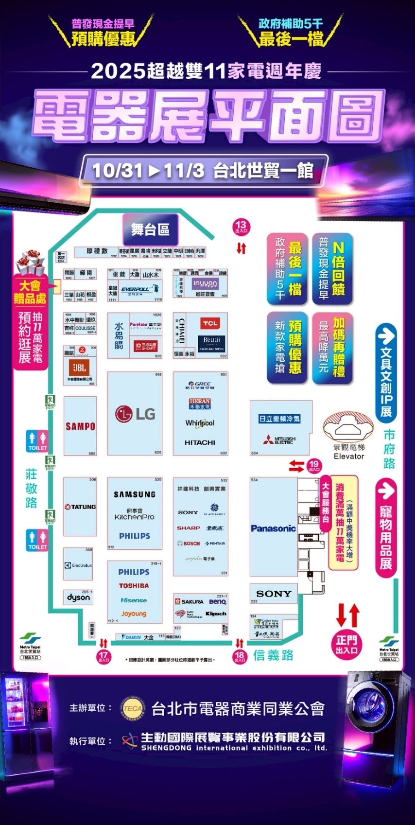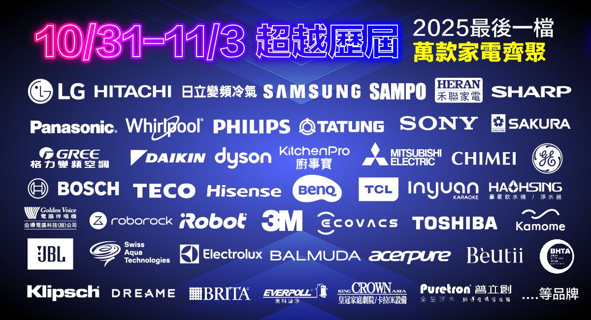 此次號召品牌齊全,超越萬款家電旗艦展出:Panasonic、LG、日立家電、日立變頻空調、Sony、Samsung、三菱電機、惠而浦、禾聯、聲寶、夏普、JBL、大同、櫻花、Bosch、格力變頻空調、大金、廚事寶、飛利浦、Toshiba、海信、九陽、dyson、BenQ、Klipsch、金嗓、音圓、伊萊克斯、奇美、普立創、TCL、3M、愛科濾淨、愛惠浦、Ge奇異、皇冠、大唐、追覓、iRobot、svago、科沃斯、BRITA、eufy、Arpha電子鎖、PENTAIR、優思免治馬桶、石頭、BALMUDA...等