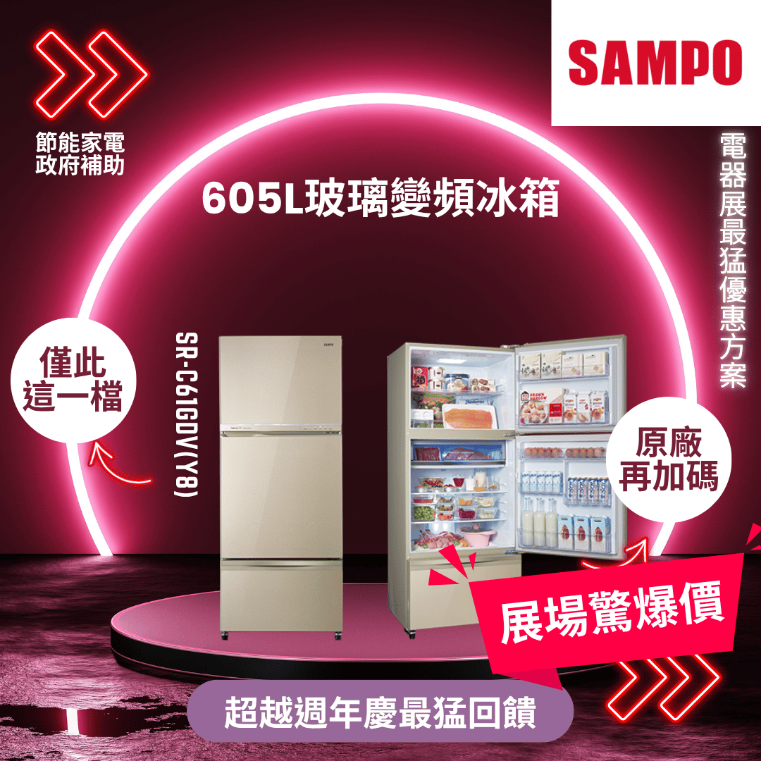 聲寶605L玻璃變頻冰箱SR-C61GDV(Y8)