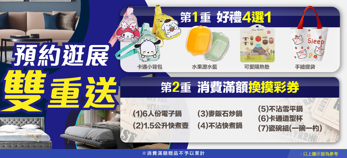 現在正是打造心目中完美家居的絕佳時機,這次的展覽提供了前所未有的大優惠,全部都有驚人的折扣等著您!不僅如此,還有針對500名預約民眾特別回饋雙重好康,別錯過這難得的機會,快來探索,讓您的居家空間焕然一新!