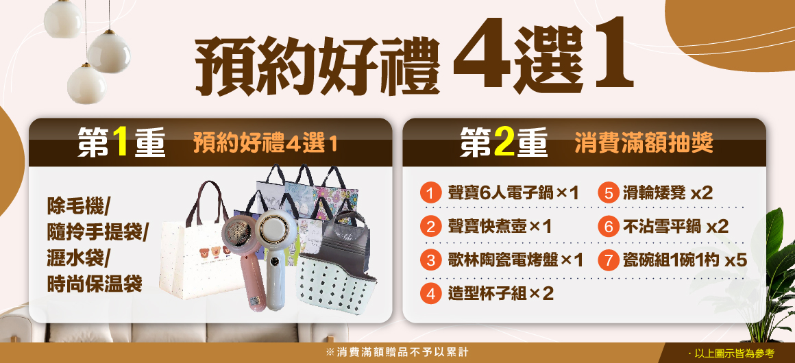 第二重:消費滿額抽獎。(1.聲寶6人電子鍋 x1、2.聲寶快煮壺 x1、3.歌林陶瓷電烤盤 x1、4.造型杯子組 x2、5.滑輪矮凳 x2、6.不沾雪平鍋 x2、7.瓷碗組1碗1杓 x5)※消費滿額贈品不予以累計。