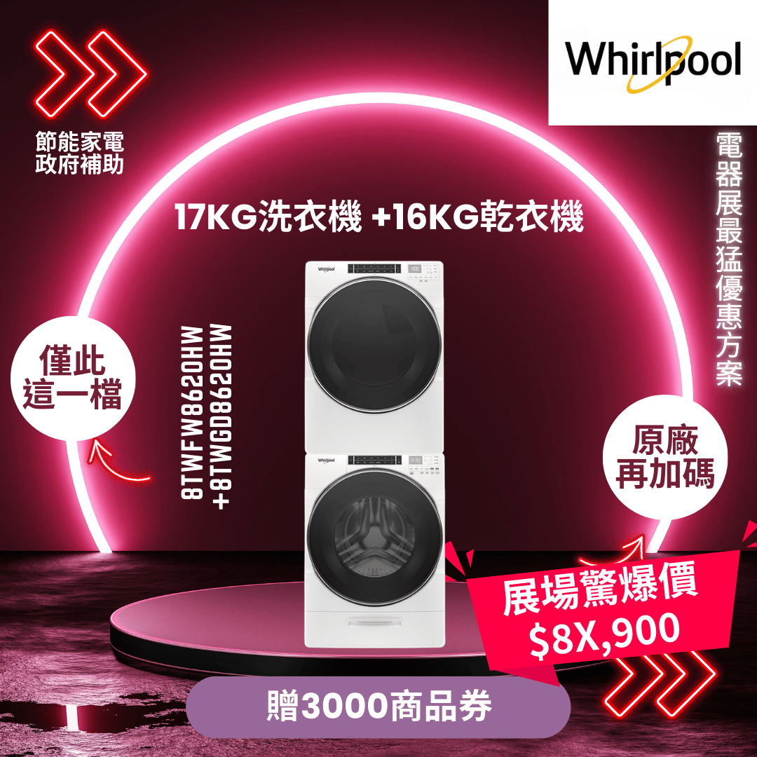 惠而浦 W Collection 17KG洗衣機 +16KG瓦斯型乾衣機 8TWFW8620HW+8TWGD8620HW