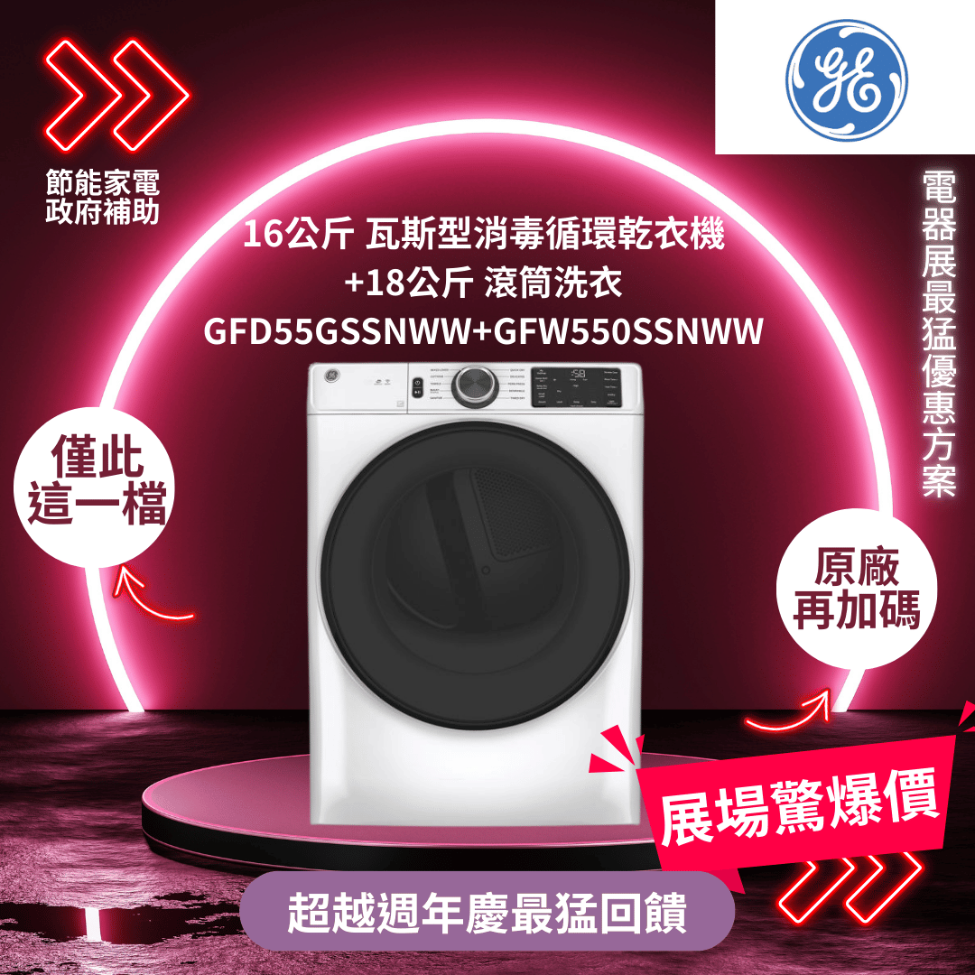 GE奇異 16公斤 瓦斯型消毒循環乾衣機 +18公斤 滾筒洗衣GFD55GSSNWW+GFW550SSNWW