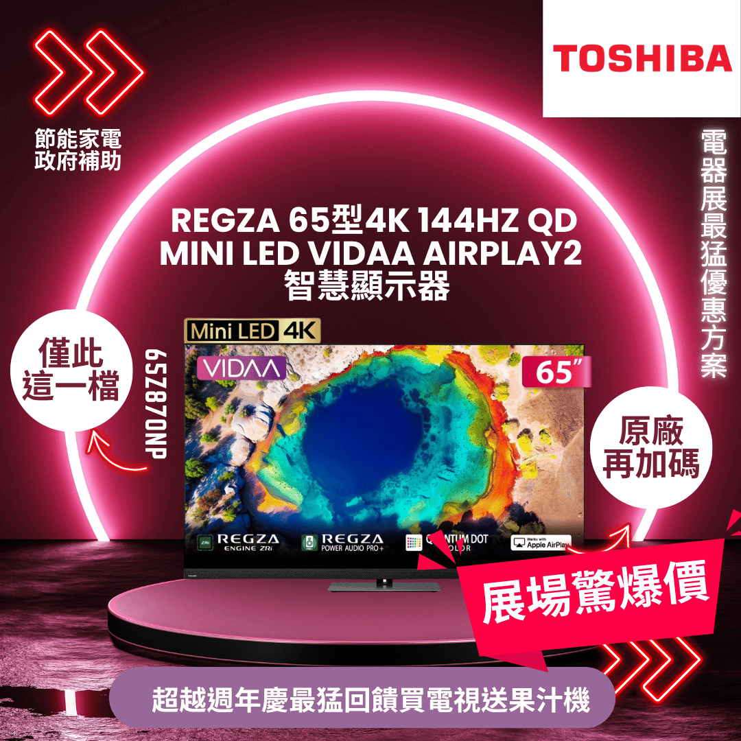 TOSHIBA東芝 REGZA 65型4K 144Hz QD Mini LED VIDAA AirPlay2 智慧顯示器 65Z870NP