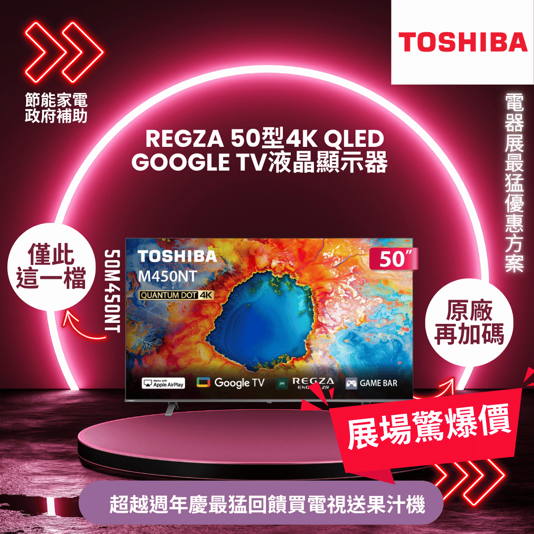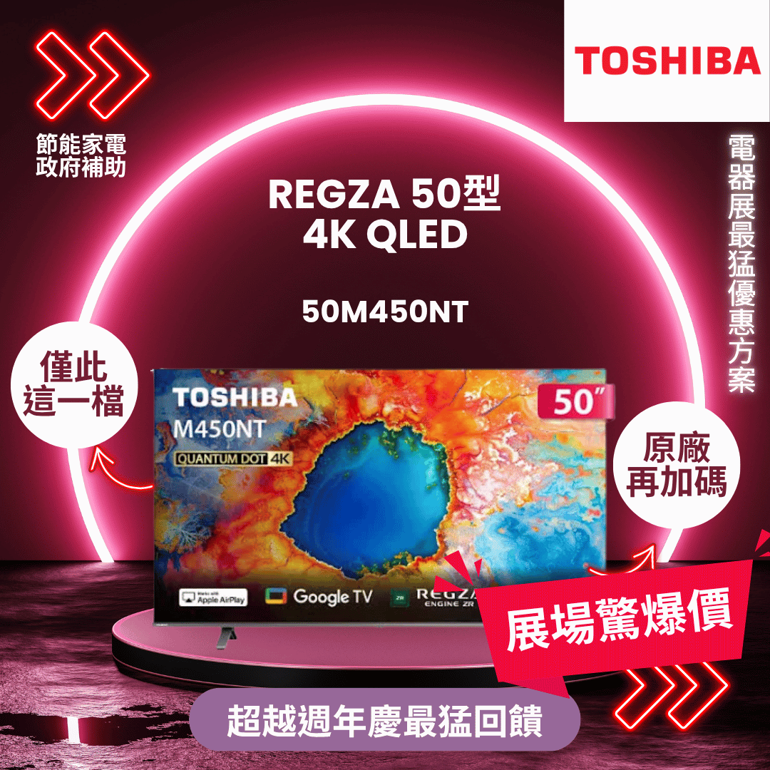 TOSHIBA東芝 REGZA 50型4K QLED Google TV液晶顯示器 50M450NT