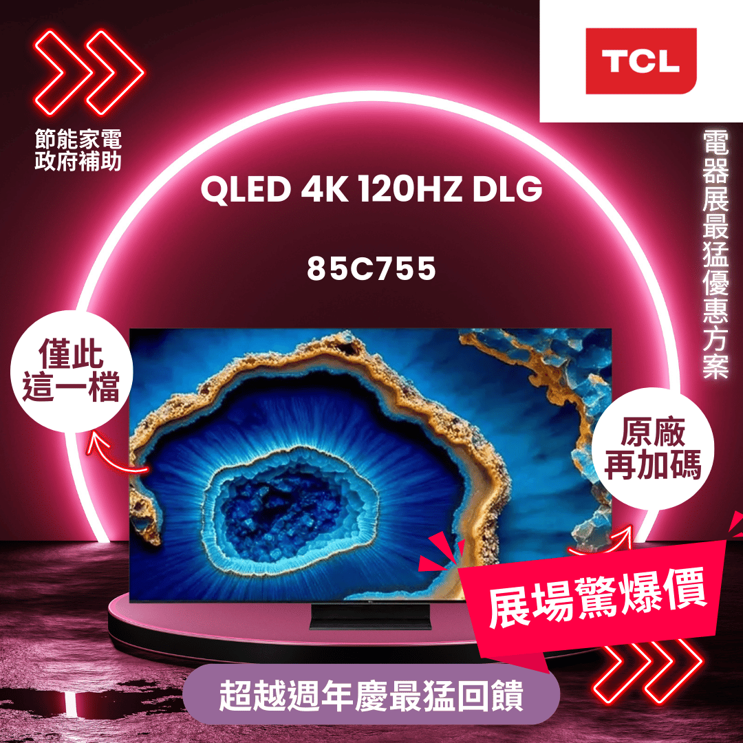 TCL 85型 4K QD Mini LED 144HZ Google TV 量子智能連網液晶顯示器(85C755-基本安裝)