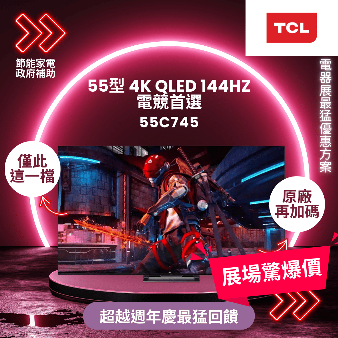 TCL 55型 4K QLED 144Hz Google TV 量子智能連網顯示器(55C745-基本安裝)