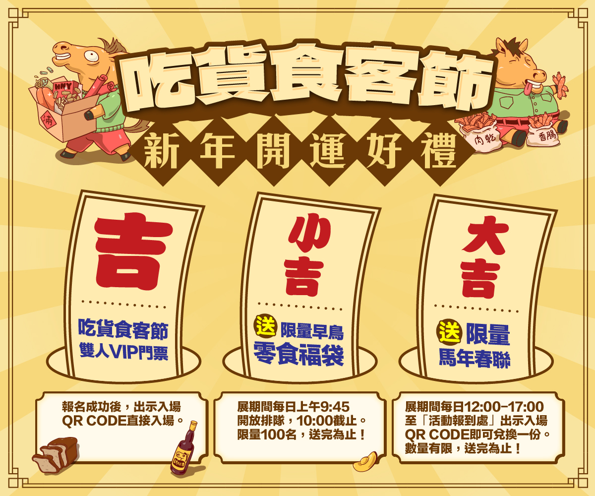 2026新年第一檔美食盛會-吃貨食客節,以「新食代・好食光」為主題,從地方風味到異國饗宴,融合傳統與創新,串連各式即食料理、伴手禮、茶、酒、點心、異國美味等多元類型,針對食客們打造一場「吃得到」、「聞得到」、「聽得到」、「摸得到」的美食盛典!