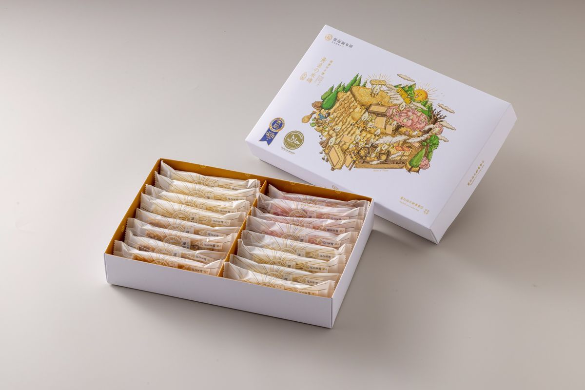 【黃金米磚】以台灣傳統米香為靈感,承襲「呷米香嫁好尪」的美好寓意,奮起福創新研發以少油、低糖、無添加的製程理念,研發出酥脆不黏牙、蓬鬆中帶紮實的創新口感。嚴選阿里山在地食材,保留米的香氣,打造出融合古早情懷與現代風味的經典米點心。每一口都是對台灣米食文化的致敬與感動。