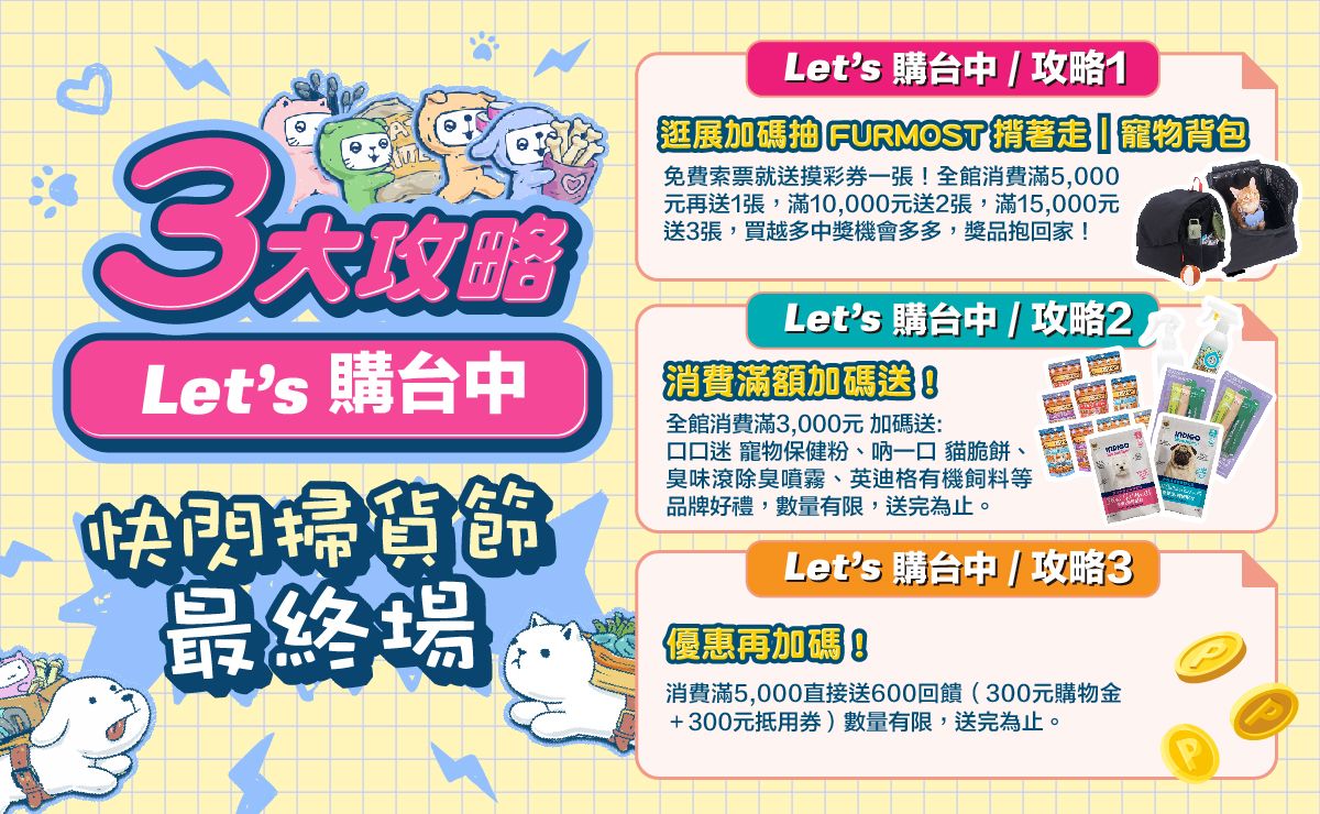 不論是補貨還是換季升級,來這裡就對了!快閃四天不只價格給力,還有品牌聯名限定、每日限量搶購、全館消費滿$5000再送$600(數量有限,送完為止)等精彩活動不間斷,從飼料到用品全包辦,毛孩換季好物一步到位!